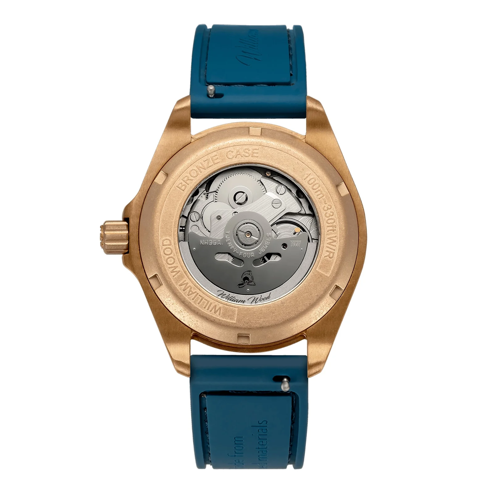 Built by the world renowned Seiko Group, our NH35 Automatic Movement is a reliable and accurate time keeping choice. The NH35 is both hacking and self-winding with a power reserve of 41 hours. For full power reserve Seiko suggests winding the crown 55 times. The NH35 has 24 jewels and a -20 seconds to +40 seconds per day accuracy. CASE MEASUREMENTS Diameter 41mm, thickness 15mm (including double domed glass 16mm), lug to lug 49mm, lug width 20mm CASE EXECUTION Brushed bronze case, aluminium rotating bezel, laser engraved caseback ring and open exhibition glass caseback GLASS Double domed sapphire crystal finished with a medium blue tint and double sided anti-reflective coating DIAL Matte curved sandwich dial with cut-out indices, green Super-LumiNova sub-layer, 3pm date window, polished hands and fire bell chime inspired seconds marker. CROWN Bronze crown with a brass inset made from a 100 year old British brass firefighter's helmet STRAPS All straps have a 20mm lug distance and a quick release functionality allowing you to change straps without any tools required WATER RESISTANT 100 Metres / 10ATM